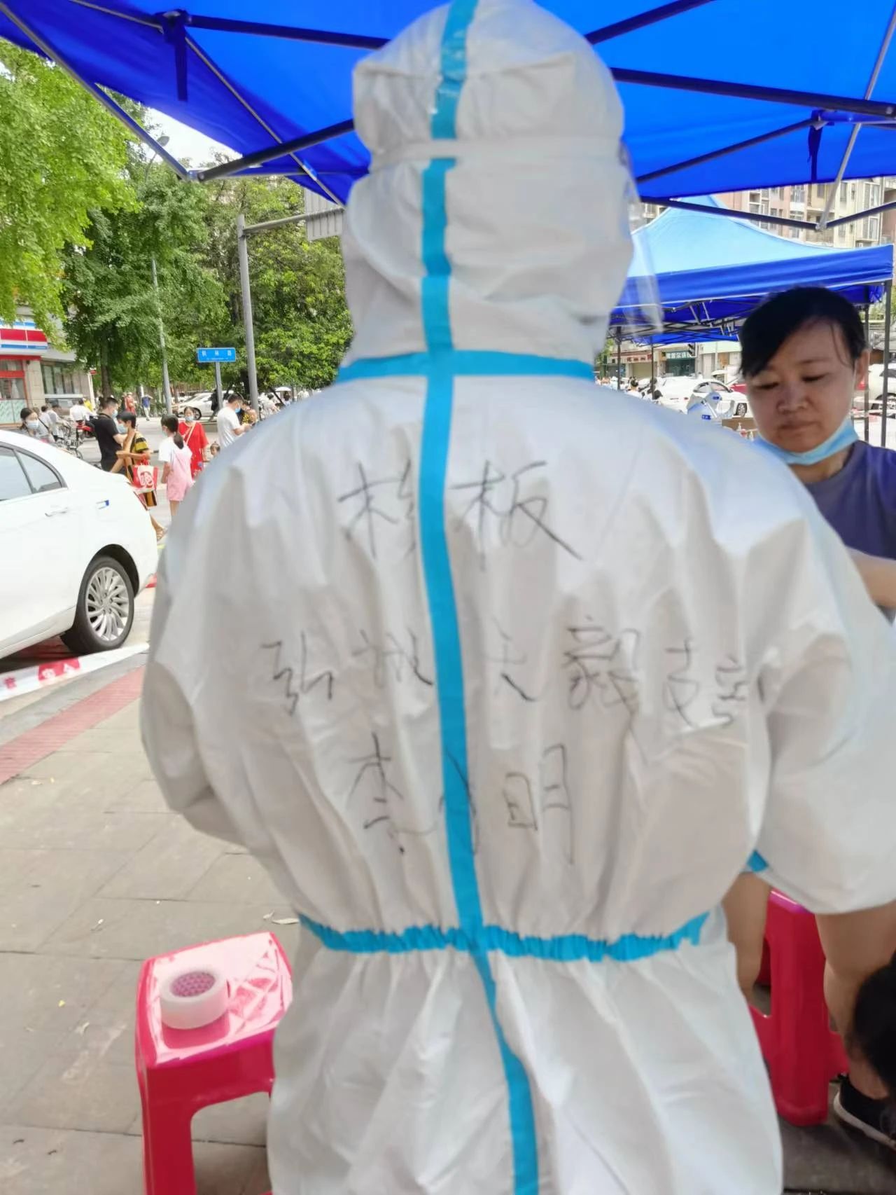 在外圍工作了3個(gè)小時(shí)之后,看著排隊(duì)隊(duì)伍越來(lái)越長(zhǎng),主動(dòng)申請(qǐng)支援大白的工作。正值中午,烈日當(dāng)下,穿上防護(hù)服的他已顧不上悶熱導(dǎo)致身體的不適應(yīng),依然井然有序的分發(fā)核酸瓶及做好核酸人員登記工作。