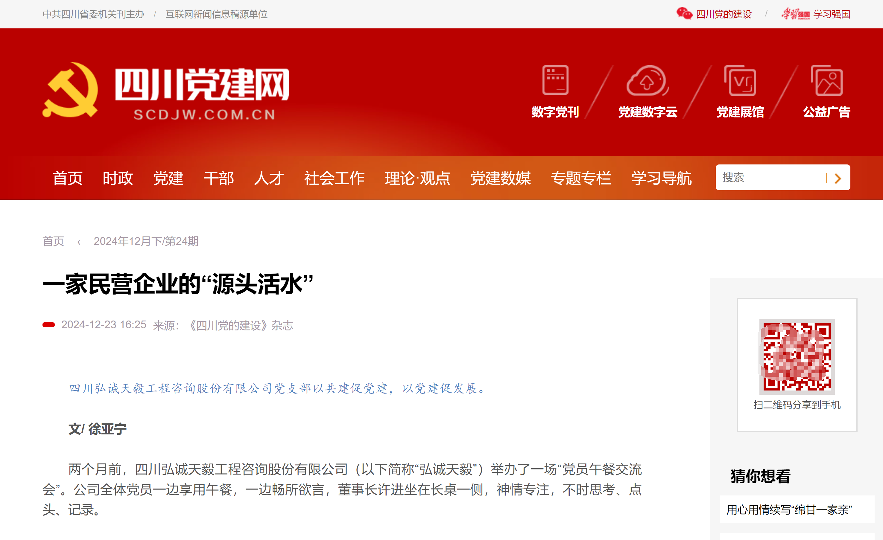 近日,由中共四川省委主管主辦的《四川黨的建設》雜志發表了一篇題為《一家民營企業的“源頭活水”》的深度報道,聚焦四川弘誠天毅工程咨詢股份有限公司(以下簡稱“弘誠天毅”)在黨建工作上的創新實踐與顯著成效,生動詮釋了“以共建促黨建,以黨建促發展”的核心理念。